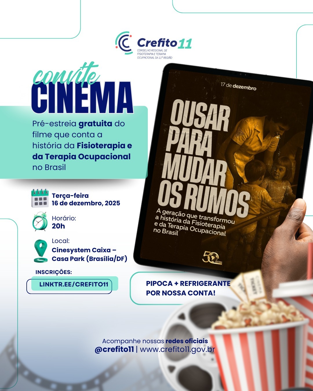 🎟️ Temos a honra de convidar você para a exibição do documentário “Ousar para mudar os rumos – A geração que transformou a história da Fisioterapia e Terapia Ocupacional no Brasil”. 🎬